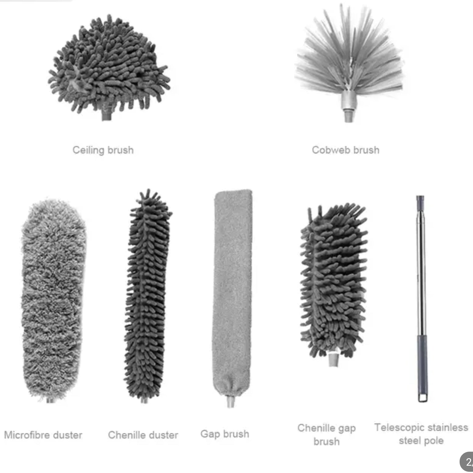 From delicate surfaces to hard-to-reach corners, our duster set has got you covered. The set includes a microfiber duster, a feather duster, a lambswool duster, a ceiling fan duster, a blind duster, a cobweb duster, and a flexible duster, ensuring that no surface is left untouched.
